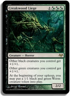 Other black creatures you control get +1/+1. Other green creatures you control get +1/+1. At the beginning of your upkeep, you may put a 1/1 black and green Worm creature token into play.