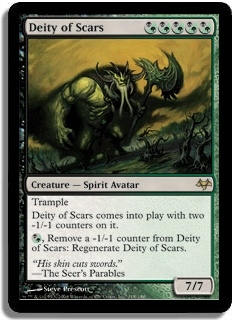 Trample Deity of Scars comes into play with two -1/-1 counters on it. o(b/g), Remove a -1/-1 counter from Deity of Scars: Regenerate Deity of Scars.