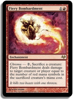 Chroma - 2, Sacrifice a creature: Fiery Bombardment deals damage to target creature or player equal to the number of red mana symbols in the sacrificed creature's mana cost.