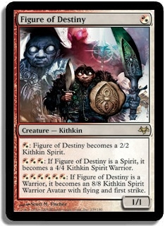 o(r/w): Figure of Destiny becomes a 2/2 Kithkin Spirit. o(r/w)o(r/w)o(r/w): If Figure of Destiny is a Spirit, it becomes a 4/4 Kithkin Spirit Warrior. o(r/w)o(r/w)o(r/w)o(r/w)o(r/w)o(r/w): If Figure of Destiny is a Warrior, it becomes an 8/8 Kithkin Spirit Warrior Avatar with flying and first strike.