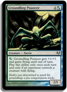 o(g/u): Groundling Pouncer gets +1/+3 and gains flying until end of turn. Play this ability only once each turn and only if an opponent controls a creature with flying.