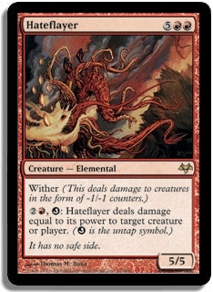 Wither (This deals damage to creatures in the form of -1/-1 counters.) 2R, oQ: Hateflayer deals damage equal to its power to target creature or player. (oQ is the untap symbol.)