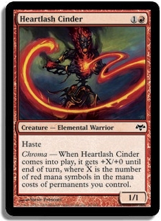 Haste Chroma - When Heartlash Cinder comes into play, it gets +X/+0 until end of turn, where X is the number of red mana symbols in the mana costs of permanents you control.