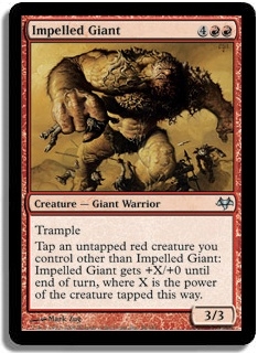 Trample Tap an untapped red creature you control other than Impelled Giant: Impelled Giant gets +X/+0 until end of turn, where X is the power of the creature tapped this way.