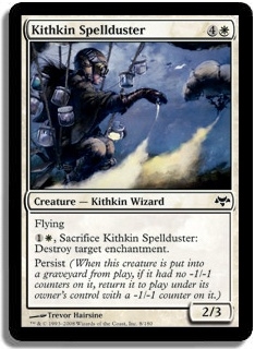 Flying 1W, Sacrifice Kithkin Spellduster: Destroy target enchantment. Persist (When this creature is put into a graveyard from play, if it had no -1/-1 counters on it, return it to play under its owner's control with a -1/-1 counter on it.)