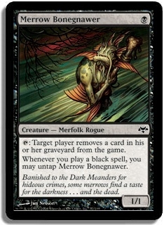 T Target player removes a card in his or her graveyard from the game. Whenever you play a black spell, you may untap Merrow Bonegnawer.