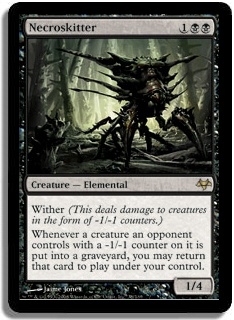 Wither (This deals damage to creatures in the form of -1/-1 counters.) Whenever a creature an opponent controls with a -1/-1 counter on it is put into a graveyard, you may return that card to play under your control.