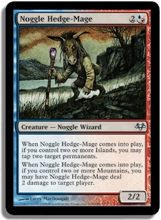 When Noggle Hedge-Mage comes into play, if you control two or more Islands, you may tap two target permanents. When Noggle Hedge-Mage comes into play, if you control two or more Mountains, you may have Noggle Hedge-Mage deal 2 damage to target player.