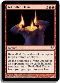 Rekindled Flame deals 4 damage to target creature or player. At the beginning of your upkeep, if an opponent has no cards in hand, you may return Rekindled Flame from your graveyard to your hand.
