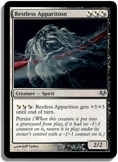 o(w/b)o(w/b)o(w/b): Restless Apparition gets +3/+3 until end of turn. Persist (When this creature is put into a graveyard from play, if it had no -1/-1 counters on it, return it to play under its owner's control with a -1/-1 counter on it.)