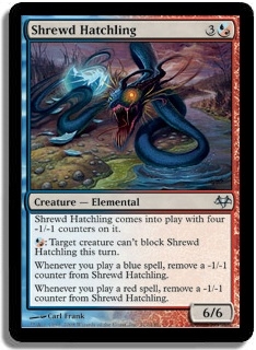 Shrewd Hatchling comes into play with four -1/-1 counters on it. o(u/r): Target creature can't block Shrewd Hatchling this turn. Whenever you play a blue spell, remove a -1/-1 counter from Shrewd Hatchling. Whenever you play a red spell, remove a -1/-1 counter from Shrewd Hatchling.