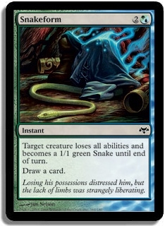 Target creature loses all abilities and becomes a 1/1 green Snake until end of turn. Draw a card.