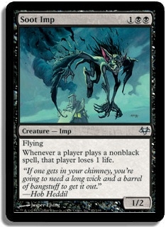 Flying Whenever a player plays a nonblack spell, that player loses 1 life.