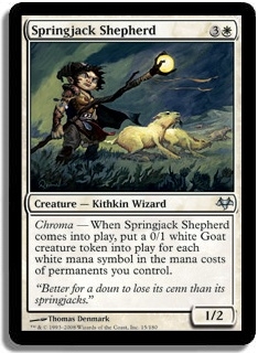 Chroma - When Springjack Shepherd comes into play, put a 0/1 white Goat creature token into play for each white mana symbol in the mana costs of permanents you control.