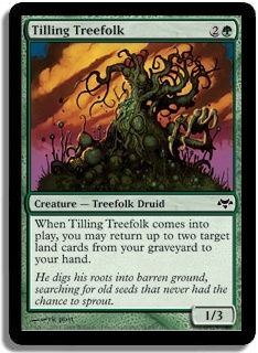 When Tilling Treefolk comes into play, you may return up to two target land cards from your graveyard to your hand.