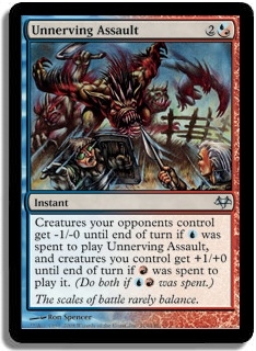 Creatures your opponents control get -1/-0 until end of turn if U was spent to play Unnerving Assault, and creatures you control get +1/+0 until end of turn if R was spent to play it. (Do both if UR was spent.)