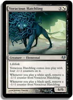 Lifelink Voracious Hatchling comes into play with four -1/-1 counters on it. Whenever you play a white spell, remove a -1/-1 counter from Voracious Hatchling. Whenever you play a black spell, remove a -1/-1 counter from Voracious Hatchling.