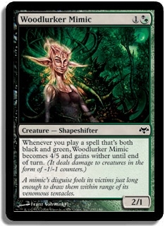 Whenever you play a spell that's both black and green, Woodlurker Mimic becomes 4/5 and gains wither until end of turn. (It deals damage to creatures in the form of -1/-1 counters.)