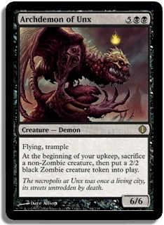 Flying, trample At the beginning of your upkeep, sacrifice a non-Zombie creature, then put a 2/2 black Zombie creature token into play.