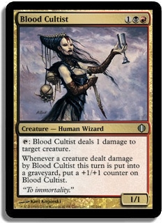 T Blood Cultist deals 1 damage to target creature. Whenever a creature dealt damage by Blood Cultist this turn is put into a graveyard, put a +1/+1 counter on Blood Cultist.