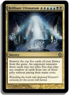 Remove the top five cards of your library from the game. An opponent separates those cards into two piles. You may play any number of cards from one of those piles without paying their mana costs.