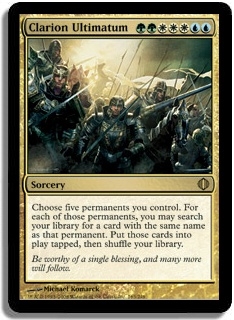 Choose five permanents you control. For each of those permanents, you may search your library for a card with the same name as that permanent. Put those cards into play tapped, then shuffle your library.