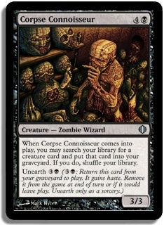 When Corpse Connoisseur comes into play, you may search your library for a creature card and put that card into your graveyard. If you do, shuffle your library. Unearth 3B (3B: Return this card from your graveyard to play. It gains haste. Remove it from the game at end of turn or if it would leave play. Unearth only as a sorcery.)
