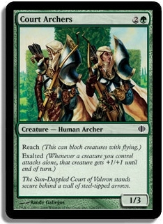 Reach (This can block creatures with flying.) Exalted (Whenever a creature you control attacks alone, that creature gets +1/+1 until end of turn.)