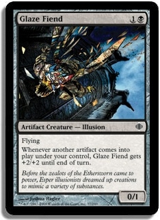 Flying Whenever another artifact comes into play under your control, Glaze Fiend gets +2/+2 until end of turn.