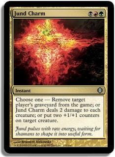 Choose one - Remove target player's graveyard from the game; or Jund Charm deals 2 damage to each creature; or put two +1/+1 counters on target creature.