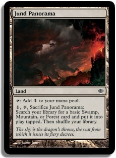 T Add 1 to your mana pool. 1, T, Sacrifice Jund Panorama: Search your library for a basic Swamp, Mountain, or Forest card and put it into play tapped. Then shuffle your library.