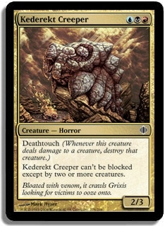 Deathtouch (Whenever this creature deals damage to a creature, destroy that creature.) Kederekt Creeper can't be blocked except by two or more creatures.