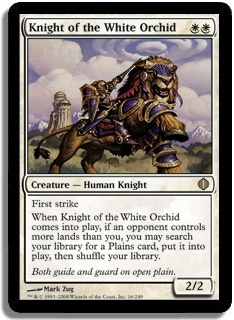 First strike When Knight of the White Orchid comes into play, if an opponent controls more lands than you, you may search your library for a Plains card, put it into play, then shuffle your library.