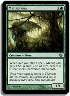 Whenever you play a spell, Manaplasm gets +X/+X until end of turn, where X is that spell's converted mana cost.