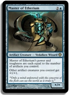 Master of Etherium's power and toughness are each equal to the number of artifacts you control. Other artifact creatures you control get +1/+1.