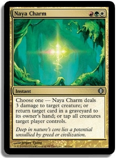 Choose one - Naya Charm deals 3 damage to target creature; or return target card in a graveyard to its owner's hand; or tap all creatures target player controls.