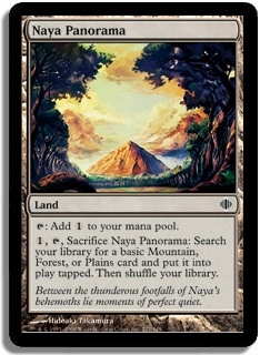 T Add 1 to your mana pool. 1, T, Sacrifice Naya Panorama: Search your library for a basic Mountain, Forest, or Plains card and put it into play tapped. Then shuffle your library.