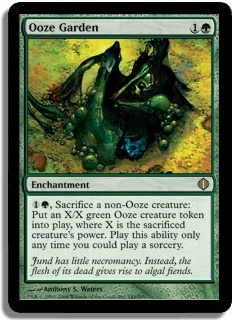 1G, Sacrifice a non-Ooze creature: Put an X/X green Ooze creature token into play, where X is the sacrificed creature's power. Play this ability only any time you could play a sorcery.