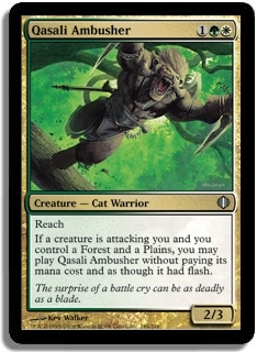 Reach If a creature is attacking you and you control a Forest and a Plains, you may play Qasali Ambusher without paying its mana cost and as though it had flash.