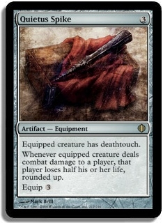 Equipped creature has deathtouch. Whenever equipped creature deals combat damage to a player, that player loses half his or her life, rounded up. Equip 3