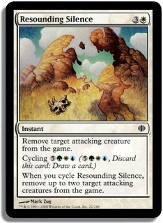 Remove target attacking creature from the game. Cycling 5GWU (5GWU, Discard this card: Draw a card.) When you cycle Resounding Silence, remove up to two target attacking creatures from the game.