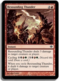 Resounding Thunder deals 3 damage to target creature or player. Cycling 5BRG (5BRG, Discard this card: Draw a card.) When you cycle Resounding Thunder, it deals 6 damage to target creature or player.