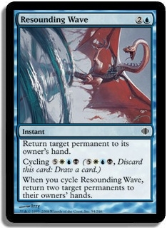 Return target permanent to its owner's hand. Cycling 5WUB (5WUB, Discard this card: Draw a card.) When you cycle Resounding Wave, return two target permanents to their owners' hands.