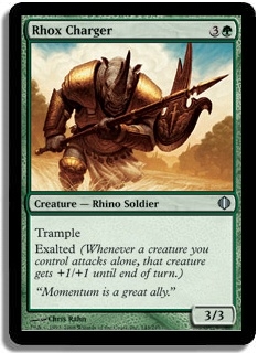 Trample Exalted (Whenever a creature you control attacks alone, that creature gets +1/+1 until end of turn.)