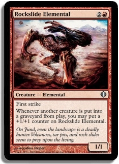 First strike Whenever another creature is put into a graveyard from play, you may put a +1/+1 counter on Rockslide Elemental.