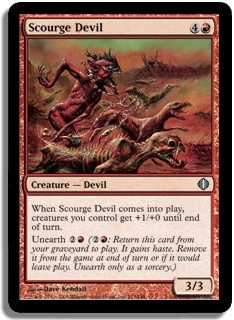 When Scourge Devil comes into play, creatures you control get +1/+0 until end of turn. Unearth 2R (2R: Return this card from your graveyard to play. It gains haste. Remove it from the game at end of turn or if it would leave play. Unearth only as a sorcery.)