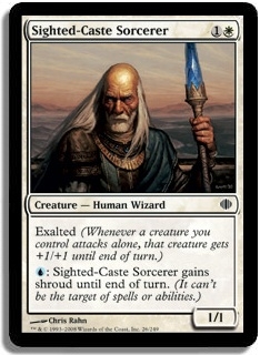 Exalted (Whenever a creature you control attacks alone, that creature gets +1/+1 until end of turn.) U: Sighted-Caste Sorcerer gains shroud until end of turn. (It can't be the target of spells or abilities.)