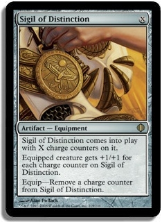 Sigil of Distinction comes into play with X charge counters on it. Equipped creature gets +1/+1 for each charge counter on Sigil of Distinction. Equip-Remove a charge counter from Sigil of Distinction.