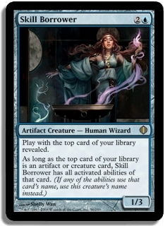 Play with the top card of your library revealed. As long as the top card of your library is an artifact or creature card, Skill Borrower has all activated abilities of that card. (If any of the abilities use that card's name, use this creature's name instead.)