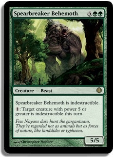 Spearbreaker Behemoth is indestructible. 1: Target creature with power 5 or greater is indestructible this turn.